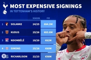 據(jù)德轉(zhuǎn)數(shù)據(jù)統(tǒng)計,6000萬歐簽下西蒙斯是熱刺隊史第四貴引援。