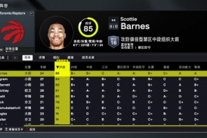 全隊(duì)有5人能力值80+,其中巴恩斯85排在第一,英格拉姆84是第二,巴雷特82、奎克利81、珀?duì)柼貭?0。