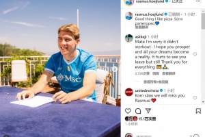 霍伊倫社媒曬出身穿那不勒斯球衣、面帶笑容的照片,配文:“還好我喜歡披薩,我是那不勒斯人?!?/p>