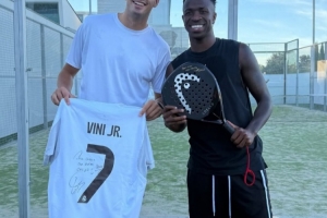 合照中科埃略獲贈維尼修斯的簽名球衣,而維尼修斯則是手持籠式網球球拍。