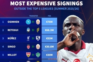 非五大聯(lián)賽球隊今夏最貴引援榜:奧斯梅恩、雷特吉、努涅斯前三