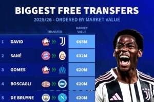 體育資訊9月4日訊 《轉(zhuǎn)會市場》統(tǒng)計了今夏自由身轉(zhuǎn)會球員的身價情況,戴維力壓薩內(nèi)居首。