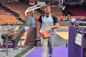東契奇背著包準(zhǔn)備離開訓(xùn)練場,他的斯洛文尼亞國家隊隊友阿倫-歐米奇表示,若東契奇能在通道里投進(jìn)三分,他就做50個俯臥撐,東契奇背著包投進(jìn)了三分。