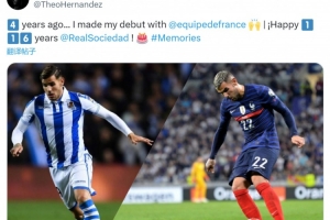 特奧社媒曬出自己身穿法國隊和皇家社會球衣的照片,配文:“4年前的今天,我在法國隊上演首秀。祝皇家社會116歲生日快樂!”