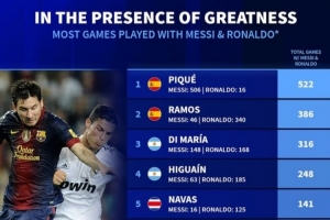 1.皮克,與梅西同場506次,與C羅同場16次,合計(jì)522次