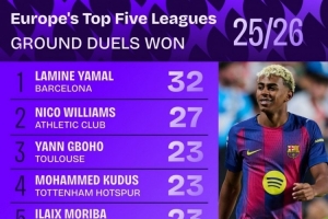 體育資訊9月12日訊 Squawka統(tǒng)計了本賽季球員在五大聯(lián)賽的地面對抗成功次數(shù),并列出榜單。