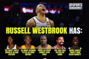 體育資訊6月29日訊 今天,NBA名宿奧尼爾轉(zhuǎn)發(fā)了一則關(guān)于威少多項(xiàng)數(shù)據(jù)榮譽(yù)的報(bào)道,詳情如下: