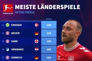 體育資訊9月14日訊 德國(guó)轉(zhuǎn)會(huì)市場(chǎng)列出了德甲現(xiàn)役球員國(guó)家隊(duì)出場(chǎng)次數(shù)榜,埃里克森144場(chǎng)居首,諾伊爾、凱恩二三位。
