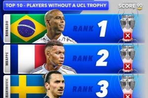 無歐冠球員TOP10:大羅居首 姆巴佩、伊布、阿圭羅、凱恩列2至5位