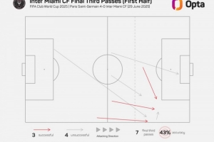 值得一提的是,邁阿密?chē)?guó)際全隊(duì)上半場(chǎng)共計(jì)在進(jìn)攻三區(qū)傳球7次,其中3次成功。