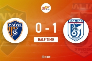 傷停補(bǔ)時(shí)3分鐘。上半場比賽結(jié)束,云南玉昆0-1大連英博。