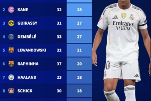 2025年五大聯(lián)賽射手榜:姆巴佩37場(chǎng)35球居首,凱恩32場(chǎng)28球次之