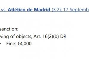 馬競方面,與利物浦的比賽中,西蒙尼與一名在90分鐘內(nèi)持續(xù)辱罵他的利物浦球迷發(fā)生了沖突,隨后吃到紅牌。西蒙尼的行為違反體育道德,被歐足聯(lián)處以歐冠停賽1場的處罰,因此西蒙尼將無法在歐冠主場對陣法蘭克福的比賽中現(xiàn)場指揮。