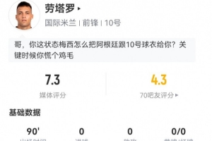 勞塔羅本場4射2正 1中框+1失良機 2關鍵傳球3造犯規(guī) 獲評7.2分