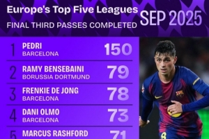 體育資訊10月1日訊 巴薩在9月份的6場比賽中,取得5勝1平。其中巴薩中場佩德里功不可沒,他被喻為哈維和伊涅斯塔的結合體。據(jù)Squawka數(shù)據(jù)統(tǒng)計,在9月份歐洲五大聯(lián)賽進攻三區(qū)成功傳球次數(shù)榜單中,佩德里以150次斷崖領先。