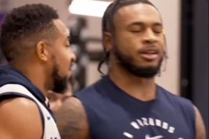 球隊(duì)新援CJ-麥科勒姆戴著麥克風(fēng)上陣,作為老將的他積極鼓勵(lì)隊(duì)友。