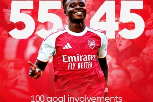 英超官方社媒曬海報(bào)向薩卡表示祝賀,并配文寫道:薩卡在英超聯(lián)賽中參與進(jìn)球數(shù)突破100個(gè)??