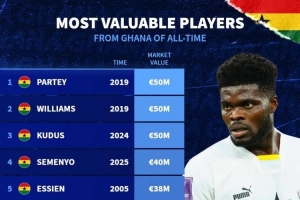 體育資訊10月13日訊 德國(guó)轉(zhuǎn)會(huì)市場(chǎng)列出加納球員歷史最高身價(jià)排名,托馬斯、伊納基-威廉姆斯、庫(kù)杜斯5000萬(wàn)歐居首。