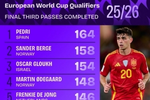 體育資訊10月15日訊 Squawka列出了歐洲世預(yù)賽進(jìn)攻三區(qū)成功傳球排名,西班牙中場(chǎng)佩德里居首。
