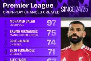 英超運動戰(zhàn)創(chuàng)造機會次數(shù)排行:薩拉赫居首 B費、帕爾默分居二三位