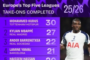 歐洲五大聯(lián)賽 25/26 賽季成功過人榜