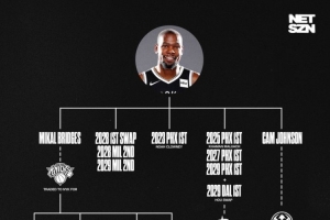 在當(dāng)年的交易中,籃網(wǎng)得到了米卡爾-布里奇斯、卡梅隆-約翰遜、4個(gè)無(wú)保護(hù)首輪簽、1個(gè)首輪簽互換權(quán)以及兩個(gè)次輪簽。之后,經(jīng)歷多筆交易,布里奇斯兌換成了5個(gè)首輪、1個(gè)首輪簽互換權(quán)以及一個(gè)次輪簽等資產(chǎn);4個(gè)無(wú)保護(hù)首輪中的其中3個(gè),籃網(wǎng)將其和另一個(gè)來(lái)自獨(dú)行俠的首輪打包送到火箭,換回了自己的兩個(gè)首輪;約翰遜兌換成了小波特和一個(gè)首輪。
