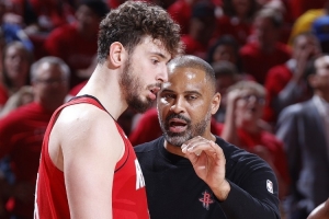 體育資訊10月22日訊 NBA常規(guī)賽揭幕戰(zhàn),火箭對陣?yán)做谋荣愐呀?jīng)進行到末節(jié)。