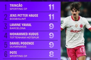 本賽季歐冠完成過(guò)人榜:特林康和海于格11次分列前二,亞馬爾第三