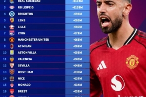 今年五大聯(lián)賽球隊身價跌幅榜:藥廠1.83億歐最多,曼聯(lián)米蘭八九位