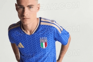 阿迪達斯標志性的加大版三條紋位于肩部,而阿迪達斯和意大利足協(xié)的徽章則采用金色,醒目地突出在藍色底色上。