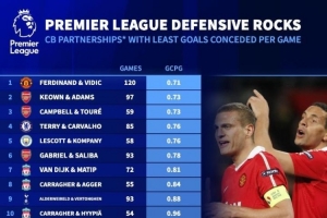 英超中衛(wèi)搭檔場(chǎng)均最少丟球榜:費(fèi)迪南德維迪奇第一,紅軍多組上榜