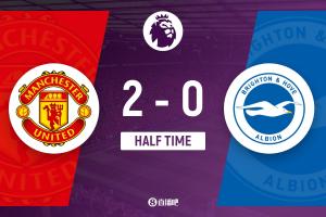上半場傷停補(bǔ)時1分鐘,半場結(jié)束,曼聯(lián)暫2-0布萊頓。
