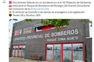 薩莫拉省議會(huì)在兩個(gè)小時(shí)前發(fā)文:兩名年輕人在 A-52(Palacios de Sanabria)的一場事故中喪生。