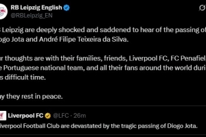 萊比錫官推寫道:“RB萊比錫對迪奧戈-若塔和安德烈-菲利佩-特謝拉-達-席爾瓦的離世深感震驚與悲痛。值此艱難時刻,我們的心與他們的家人、朋友、利物浦足球俱樂部、佩納菲耶爾足球俱樂部、葡萄牙國家隊以及全球所有球迷同在。愿逝者安息?!?/p> 利物浦前鋒若塔因車禍離世,年僅28歲