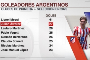 進(jìn)入2025年,阿爾瓦雷斯在俱樂部和國家隊已打進(jìn)27球,阿根廷球員中僅次于梅西的41球。在阿爾瓦雷斯身后是勞塔羅(26球)、維格蒂(26球)、貝爾泰拉梅(26球)、斯皮內(nèi)利(25球)、尼古拉斯-馬丁內(nèi)斯(24球)以及何塞-洛佩斯(23球)。