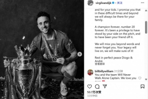 體育資訊7月4日訊 利物浦前鋒若塔因車禍去世,年僅28歲。利物浦隊(duì)長(zhǎng)范迪克也通過社媒撰文送上悼念: